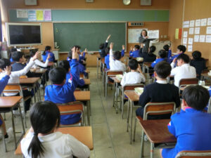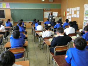 栄養士の浜谷先生に来ていただき、給食や食に関するお話をしていただきました。テーマは「地産地消」。地産地消とはどのようなことなのか、なぜ推奨されているのかなどを教えていただいたり、給食でも滑川産のいろいろな野菜が使われていることを知ったりすることができました。農家の方、給食を作ってくださっている方、献立を考えてくださる方等、多くの人に感謝をして、これからも給食を美味しくいただきましょう。