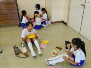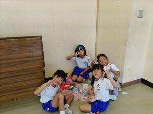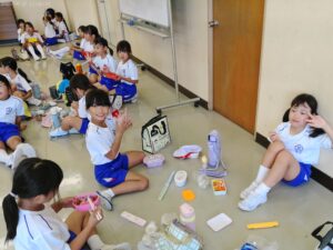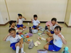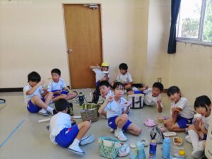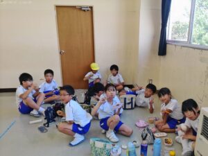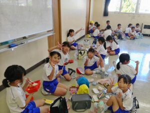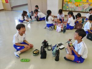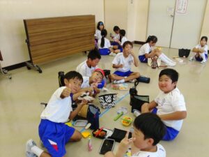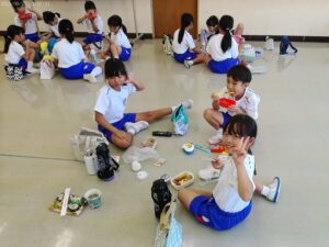 運動会の楽しみの一つ、「お弁当タイム」です。2年生と3年生で仲良く食べました。お家の人の作ってくれたお弁当は格別ですね。