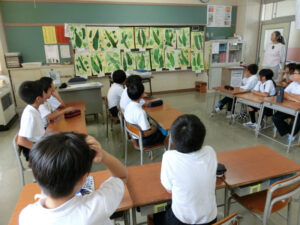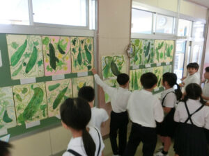 9月から取り組んでいる絵画展「ぼくたちわたしたちが育てたヘチマ」の作品が完成しました。ヘチマをよく見ながら、色使いや形等を工夫して描くことができました。そして、お互いの作品を鑑賞しました。友達の作品のステキなところを伝え合うことができました。