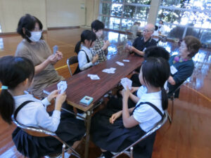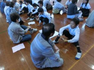 10月17日(金)に北加積地区老人クラブ連合会の方をお呼びして「あくしゅのつどい」を行いました。自己紹介した後、一緒にペタンクをしたり、昔の遊びをしたりしました。初めは少し緊張していた子供たちでしたが、いろいろな話をしたり、活動したりしながら楽しい時間を過ごすことができました。北加積地区老人クラブ連合会のみなさん、ありがとうございました。