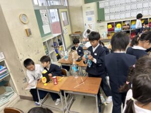 2年生図画工作科では「音づくり フレンズ」の学習をしています。音のなる仕掛けを作り、仕掛けから出る音からイメージを膨らませて飾りつけをしました。