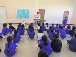 読み聞かせをしてもらいながら、1年生は、いっしょに声を合わせて読んだり、2年生はウクレレに合わせて歌ったり踊ったりしました。とても楽しい時間になりました。
