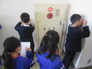 3年生は、社会科で消防のはたらきについて学習しています。 今日は、学校のどこに、どのような消防設備があるのか、実際に校内を回って確かめました。