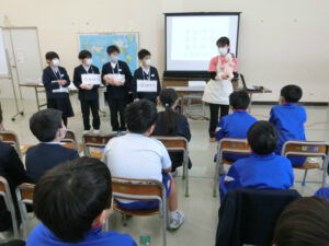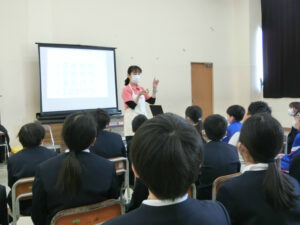 助産師さんをお招きして、「いのちの教室」を行いました。いのちのルーツや赤ちゃんの成長について、動画や模型等で分かりやすく教えてくださいました。実際に赤ちゃんの模型を持つと、「こんなに重いんだ」「この赤ちゃんがお母さんのお腹の中で育っているんだ」など様々な思いをもっていました。いのちを大切にすることはもちろん、自分を大切にすることや他の人も大切にすることも教わりました。最後に言われた言葉は、「生きているだけで100点満点」です。辛いことや苦しいこともありますが、この言葉を胸にこれからも生きてほしいです。