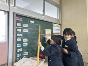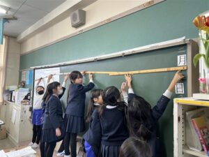 2年生算数科では長さの学習をしています。1mものさしを使って長いものの長さを測りました。
