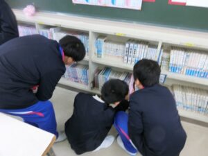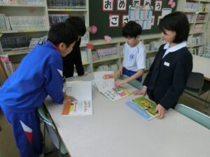 1,2年生に読み聞かせをするために、本を選びに図書室へ行きました。